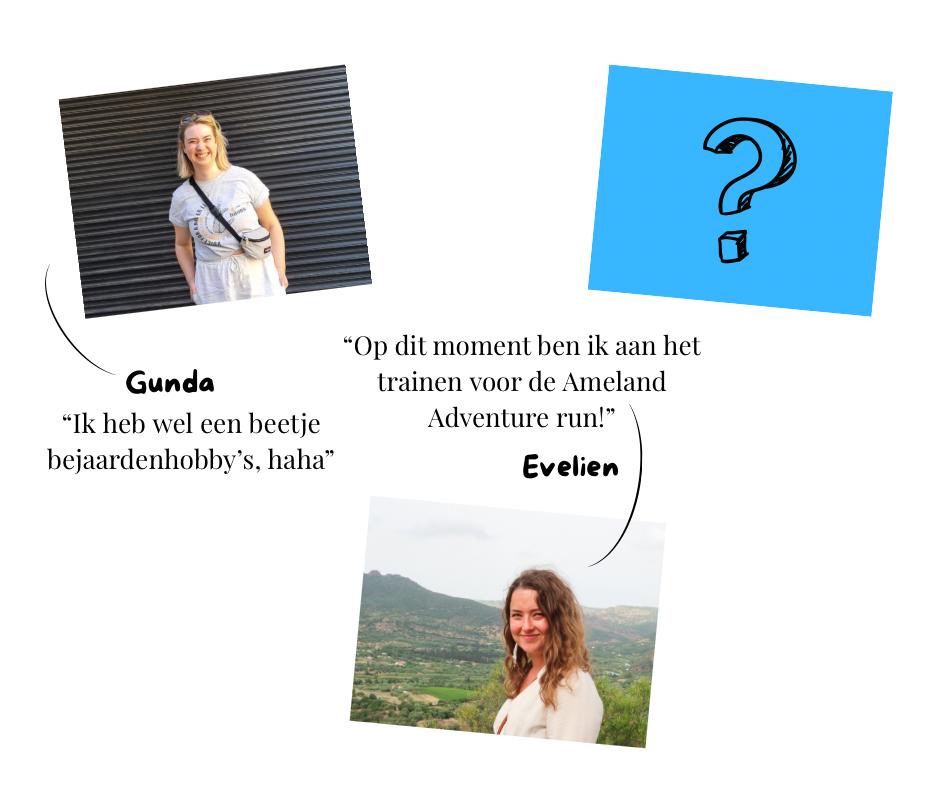 We zijn twee positief ingestelde meiden met een duidelijke gemene deler: een grote voorliefde voor creatieve freubelactiviteiten en flora & fauna. “Ik houd van kunst en allerlei creatieve dingen, zoals naaien en ander soort handwerkjes. Ook heb ik een Cinevillepas, dus ik ben regelmatig in het Groninger Forum te vinden. En heel af en toe pak ik de verrekijker erbij, om vogels te spotten. Ik heb wel een beetje bejaardenhobby’s, haha.” Aldus Gunda. Evelien: “In mijn vrije tijd sta ik graag in de keuken om nieuwe recepten uit te proberen (Lang leve de Allerhande!), en ga ik graag sporten. Op dit moment ben ik aan het trainen voor de Ameland Adventure run! Verder ben ik gek op bloemen en planten, ik ben dan ook helemaal in mn nopjes met onze nieuwste aanwinst op het balkon: de mini moestuin.”