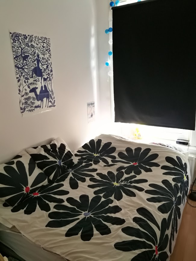 Slaapkamer van ongeveer 9m2. Klinkt klein, maar er is naast een 2-persoonsbed ook ruimte voor een bureautje en je maakt natuurlijk gebruik van de grote woonkamer.