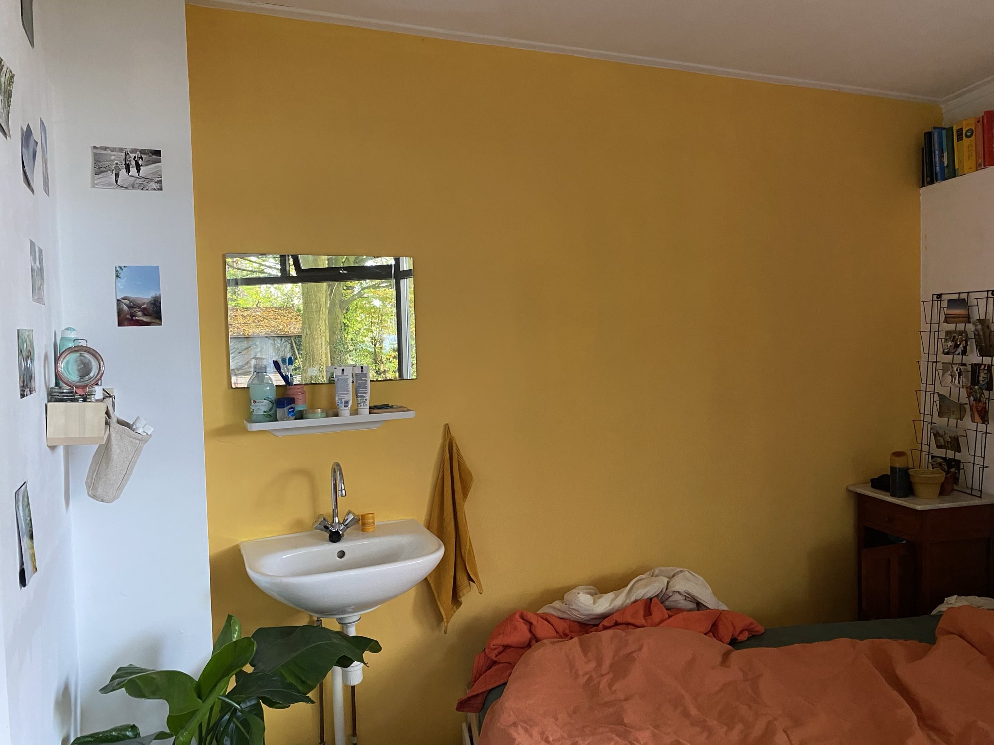 We delen een ontzettend mooi groot rond huis met 11 mensen, 1 grote woonkamer, 1 kunstkamer, tuin (300m2), grote keuken en prachtig uitzicht op groen. Er is ook parkeergelegenheid. Iedereen heeft een eigen slaapkamer met wasbak. Er zijn twee douches en vier wc's.