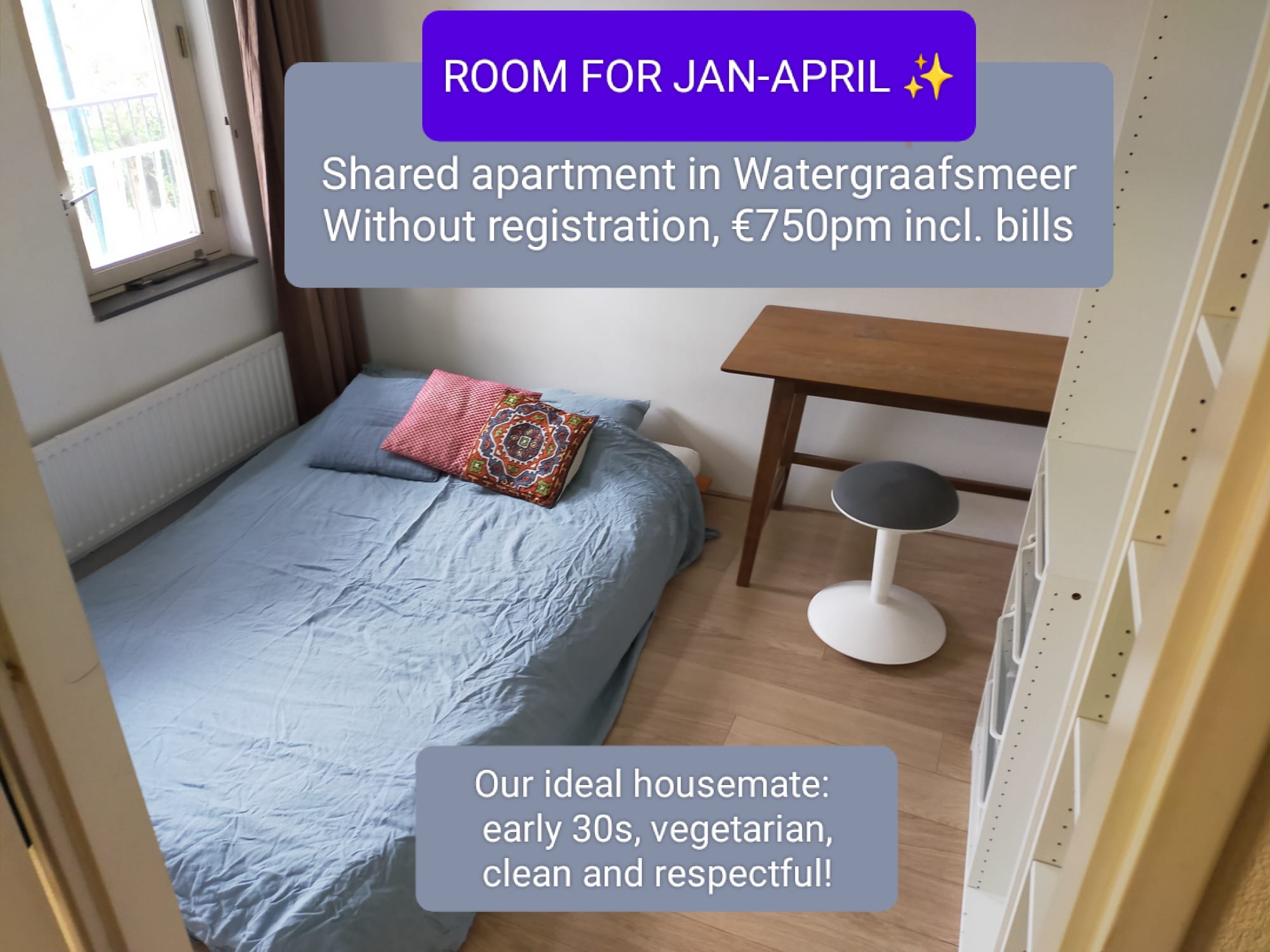 One of the rooms is available from January until the end of April and about €800 p/m incl. bills.