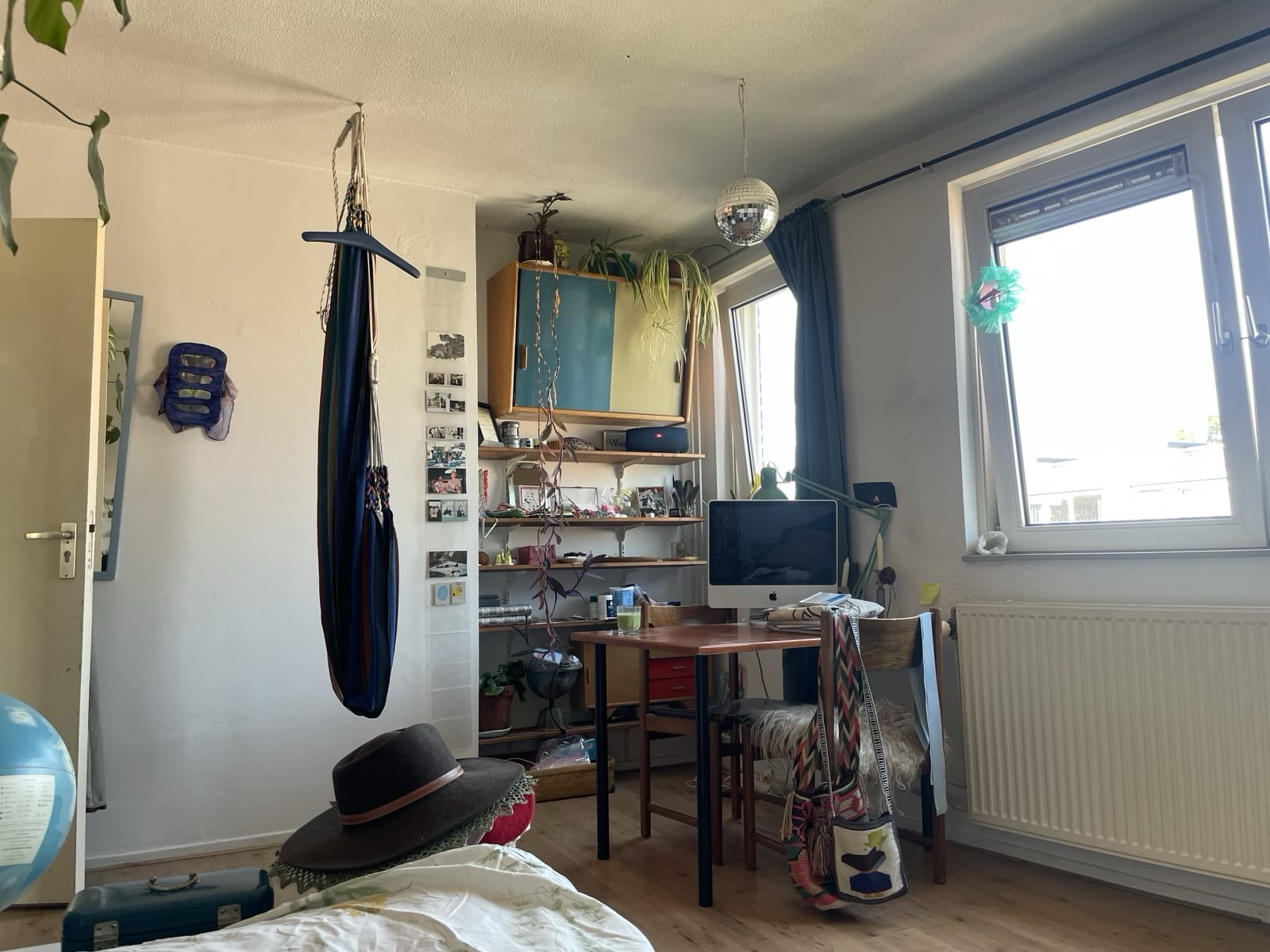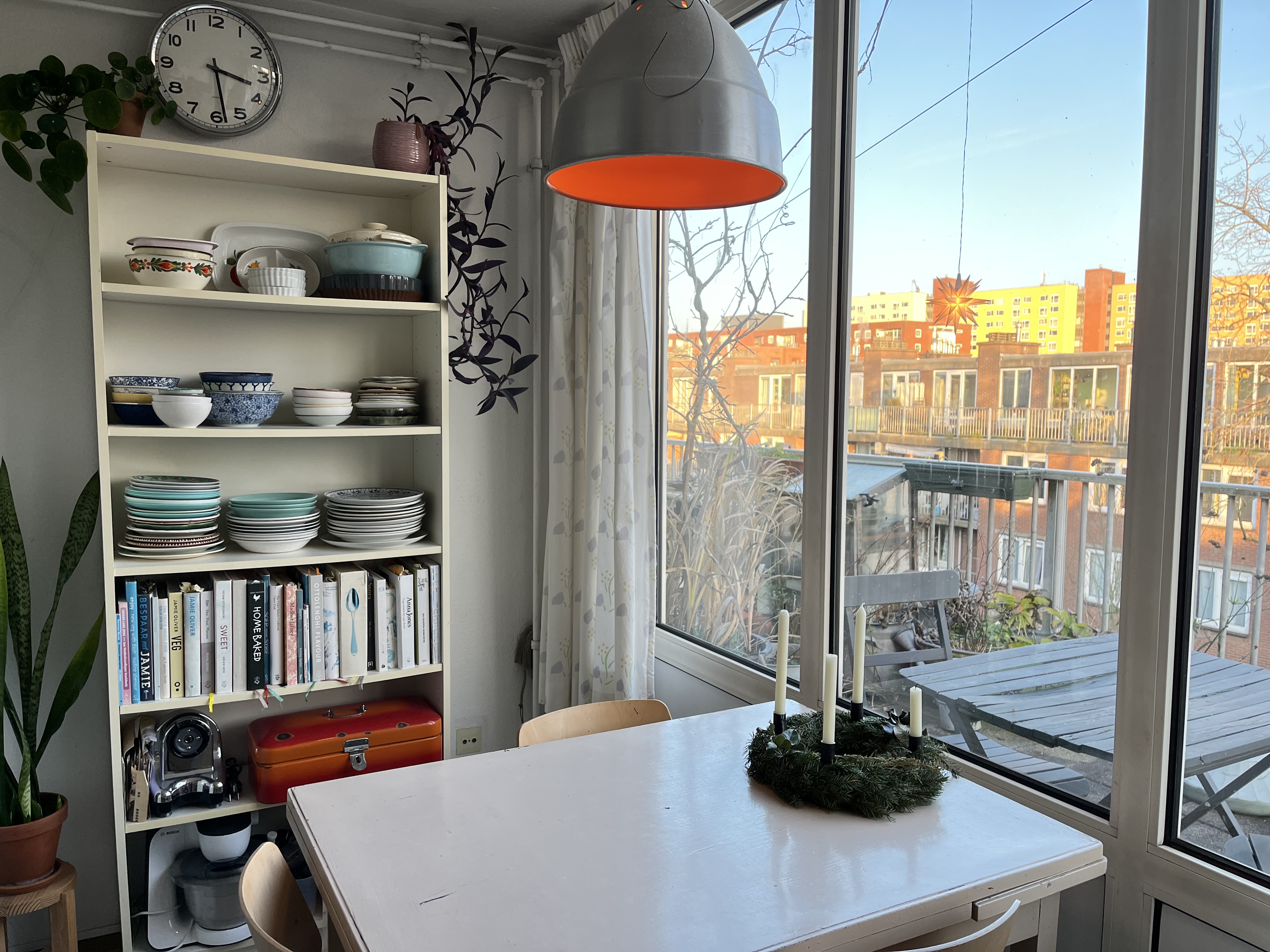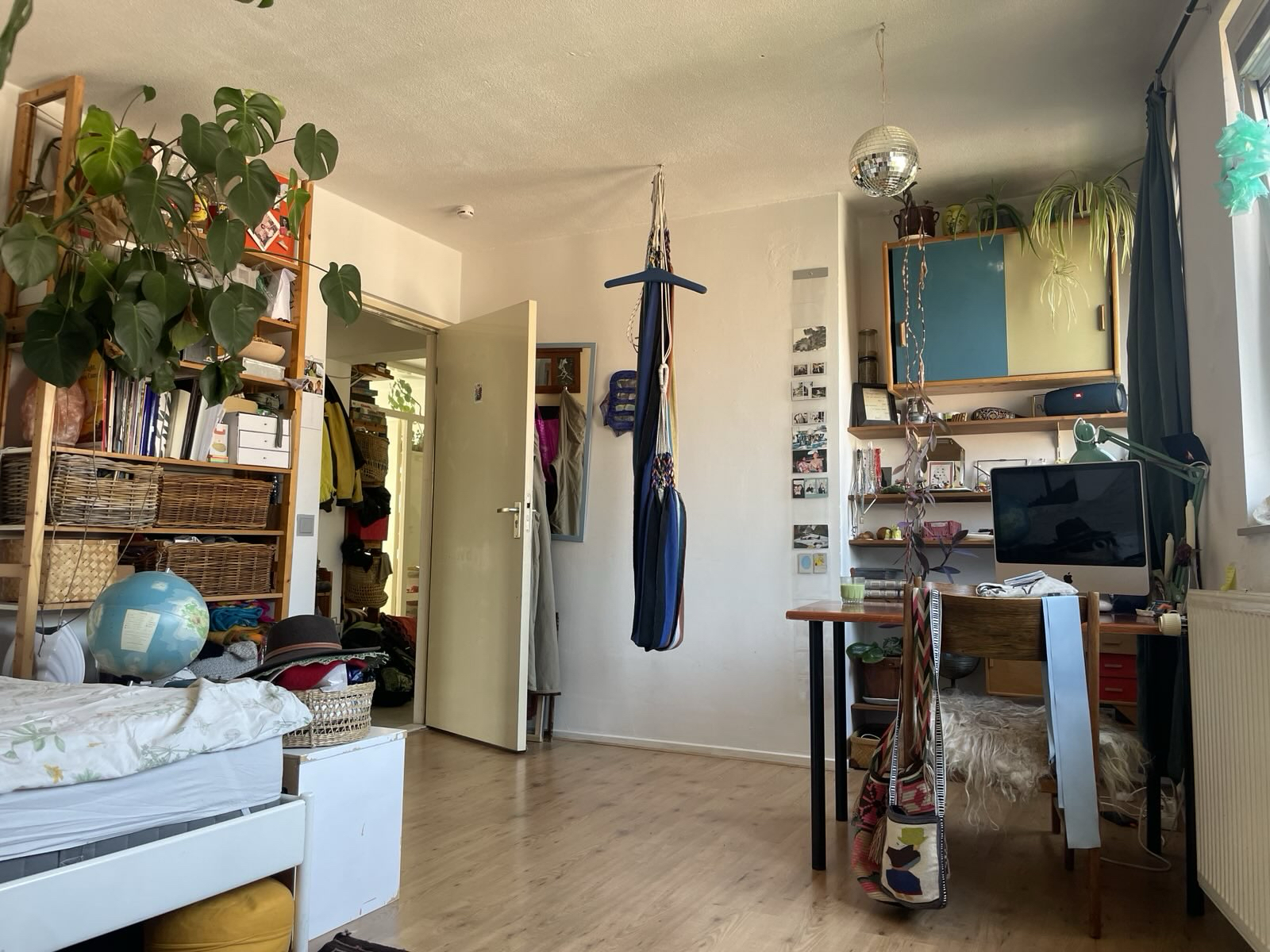 De keuken annex woonkamer, met vaatwasser, tv en aangrenzend mega balkon van ongeveer 35m2 vol bloemen en planten delen we met zijn vieren. Verder deel je een badkamer, wc en een inloopkast met zijn tweeën. Beneden hebben we nog een schuur. Aan de achterkant van het huis kijken we uit op een binnentuin die wordt onderhouden door de Alliantie.