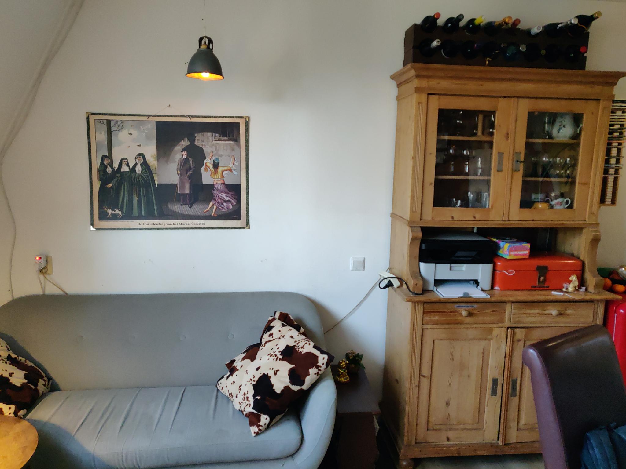 We delen een mooie woonkamer, keuken, badkamer, toilet, vliering en fietsenhok.