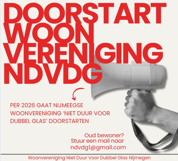 In 2026 gaat de Nijmeegse woonvereniging Niet Duur Voor Dubbel Glas doorstarten! De hypotheken die de 4 huizen in de jaren ’90 hebben afgesloten verlopen dit jaar, en met alle huizen gaan we gezamenlijk doorstarten. Voor de eindafrekening hebben we up-to-date contactinformatie nodig van oud bewoners. Ben je oud bewoner van onze woongroep? Stuur dan een e-mail naar ndvdg1@gmail.com en dan nemen we contact met je op