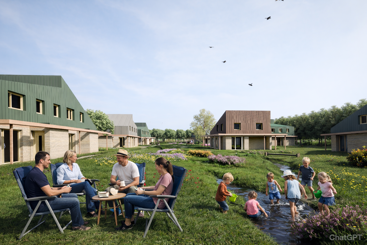 Parkeren doen we aan de rand van het terrein, dus geen auto's naast de huizen.