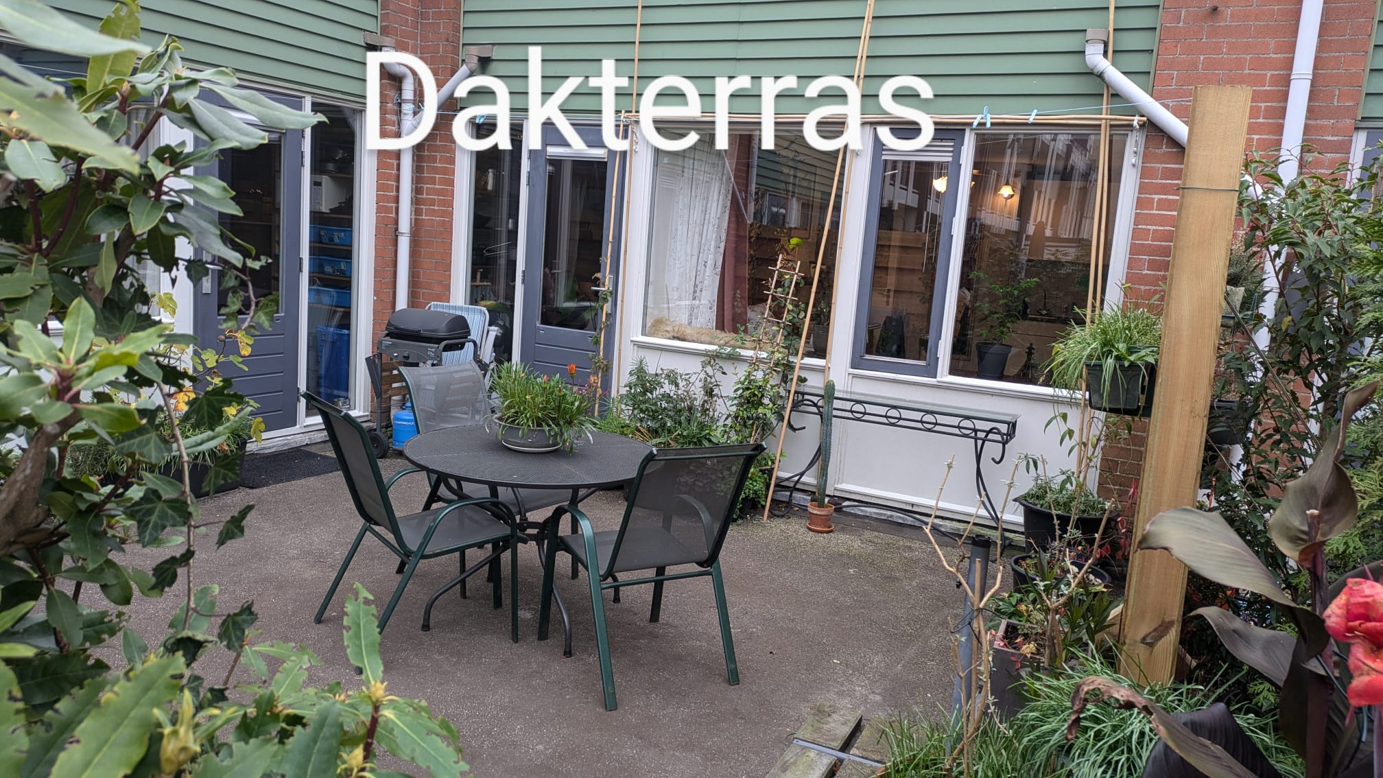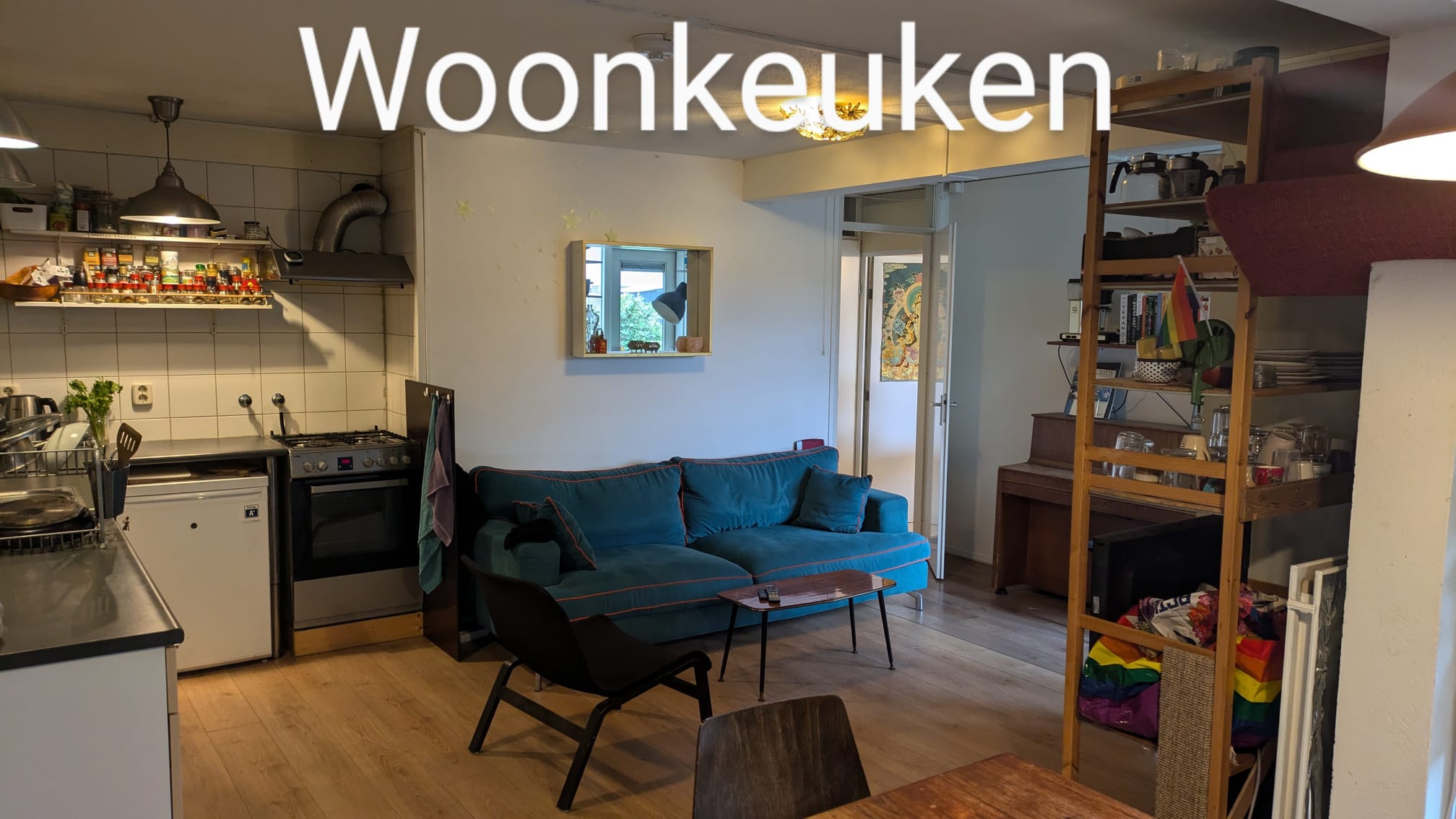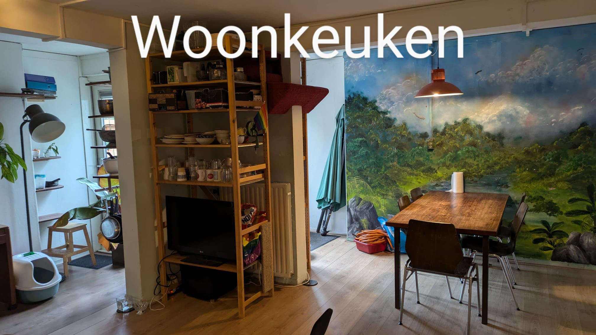We delen een ruime woonkeuken, berging, kleine klushoek en groot dakterras. De WC deel je met 1 andere persoon, de badkamer met 3 personen.