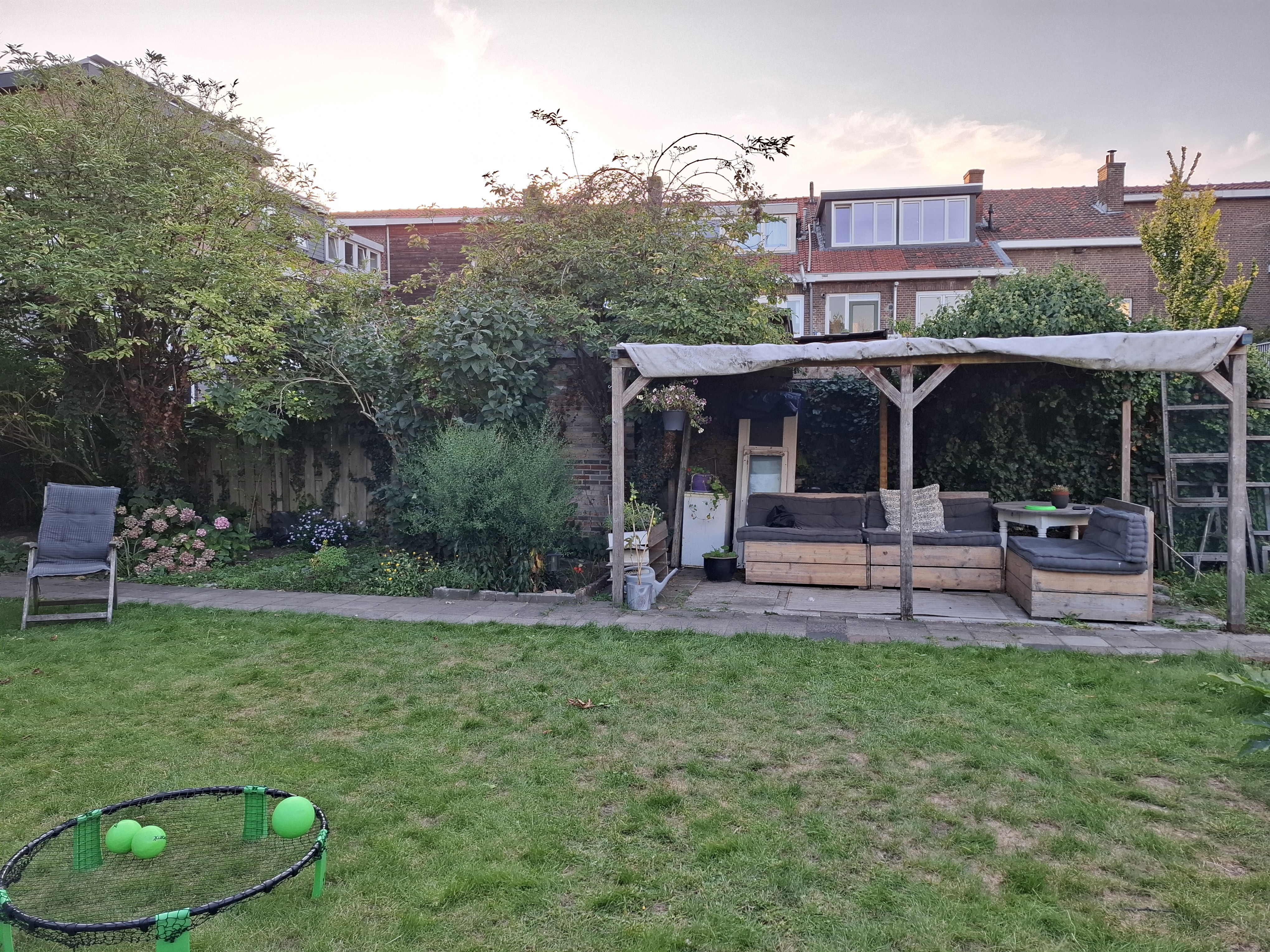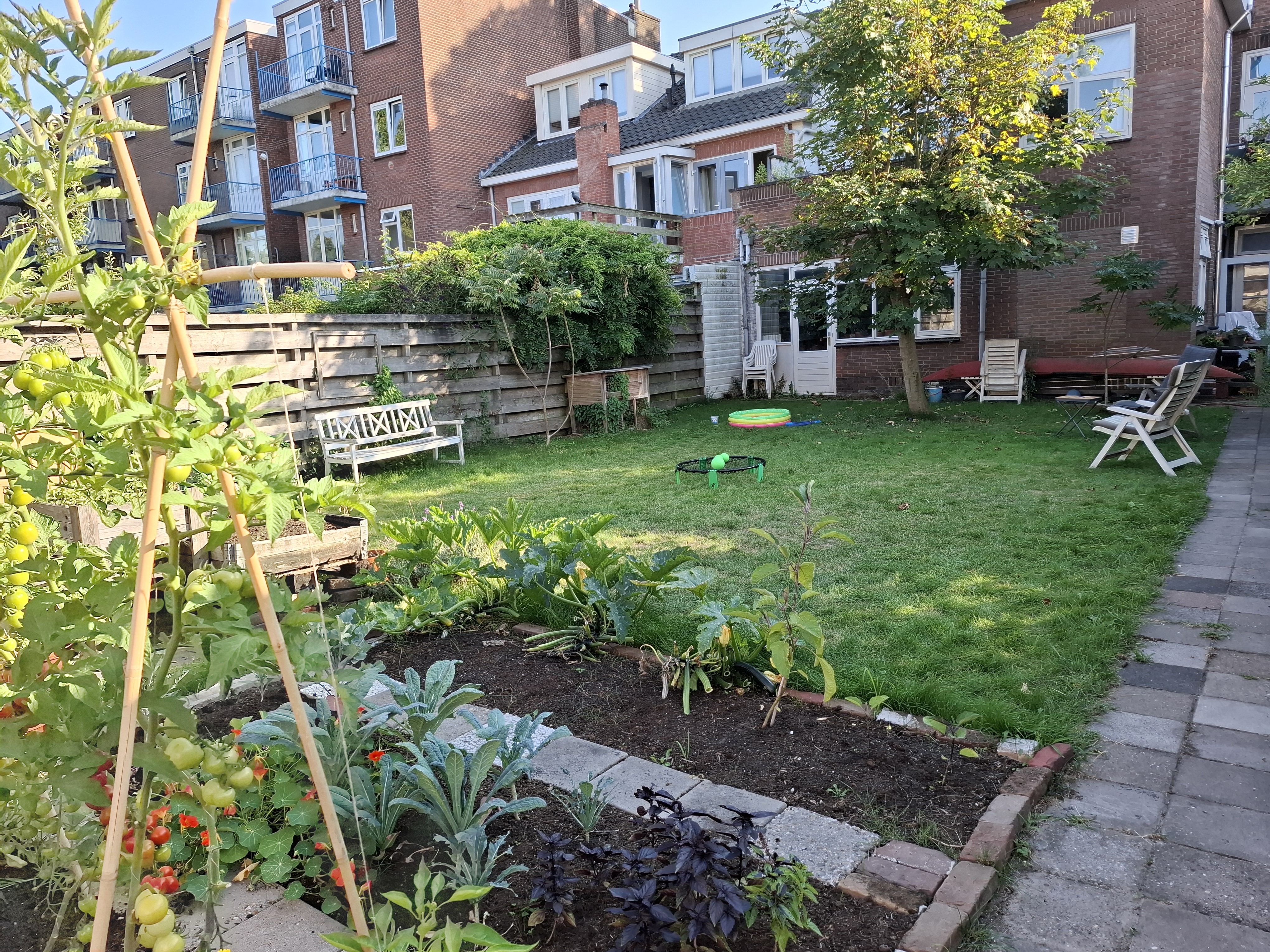 Gedeelde woonkamer, keuken, badkamer, wc en tuin (grasveld, meerdere zitplekken en moestuin).