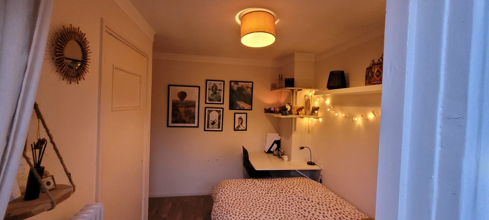 The available room is 8,5 sqm and has a cozy balcony facing South, an in-wall wardrobe and a little built-in desk. Note: the room picture that you see underneath doesn’t reflect the current furniture! At the moment there’s a high bed with a double mattress and a couch underneath. All the furniture you will see during the viewing can either stay, be donated or repurposed if you wish to bring your own. You are free to change the room in whatever way suits you best.