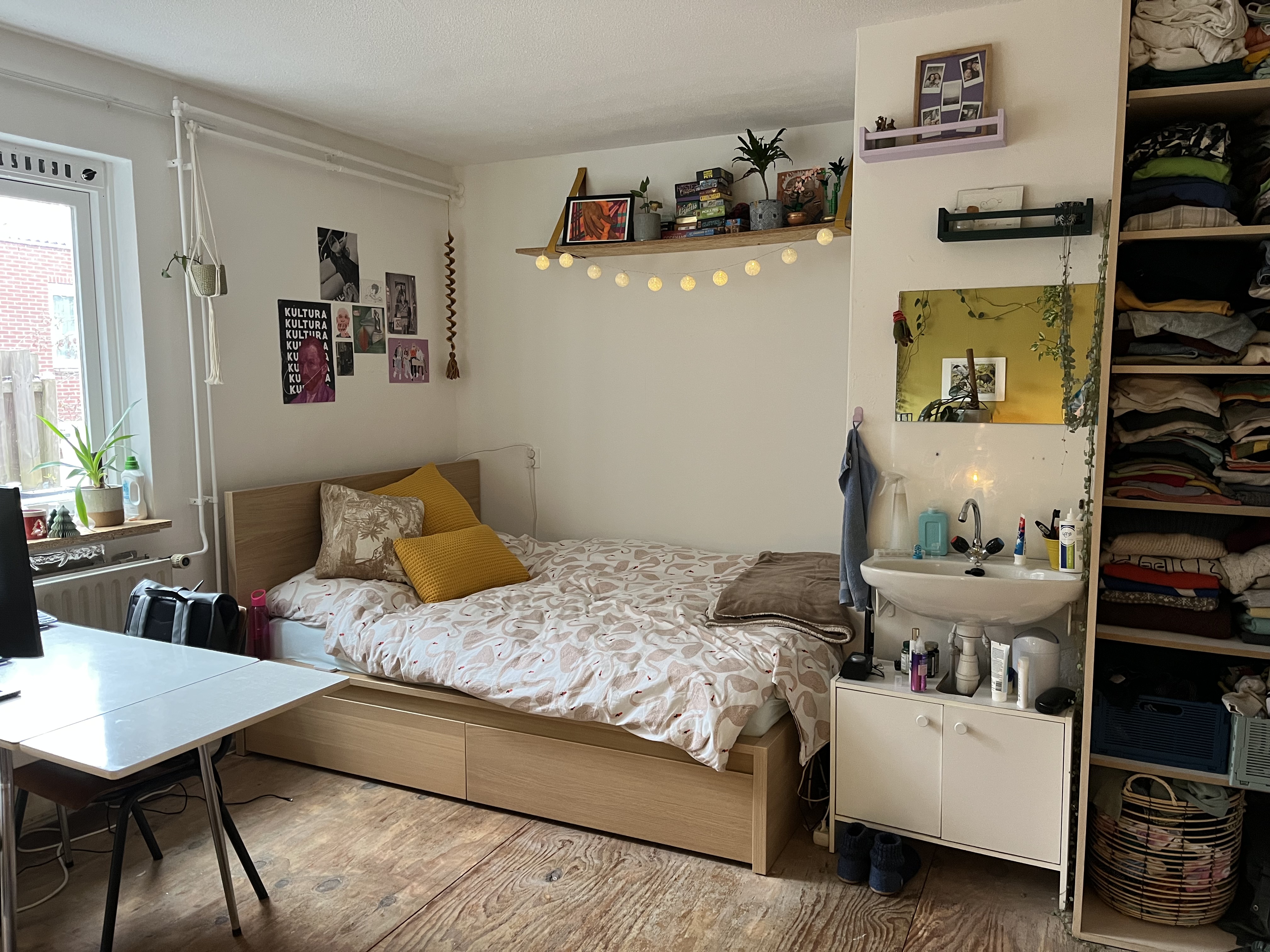 Eigen kamer +/- 17m2. Met wasbak met Frans-balkonnetje en een eigen berging in de kelder.