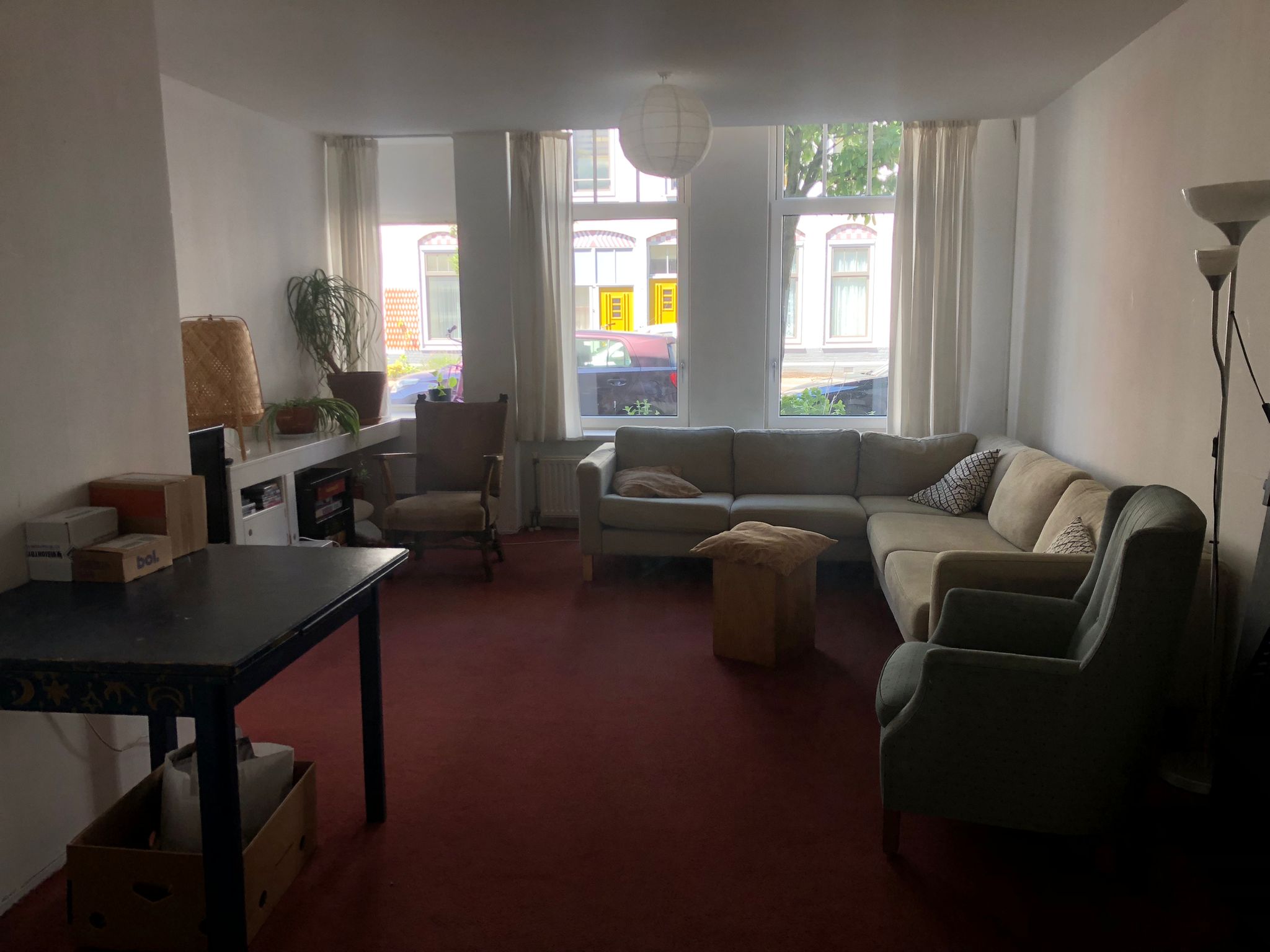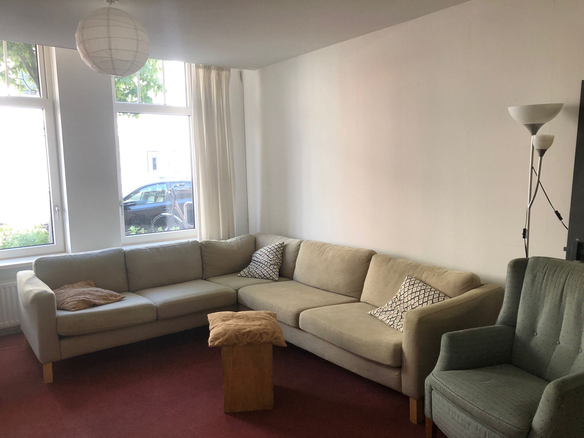 Een lichte kamer met twee grote ramen en een deur naar een gedeeld balkonnetje op het westen. De kamer is ongeveer 24m2 inclusief een ruime inbouwkast. Foto's van de kamer zelf volgen nog.